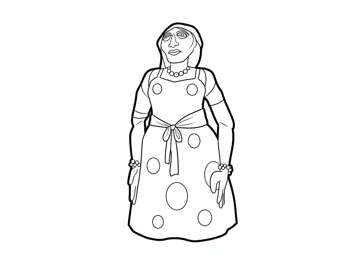 Ella va vestida amb un vestit blau marí i també porta la senyera catalana. Als braços porta braçalets de petxines i també collarets. També porta un mocador blau marí al cap.