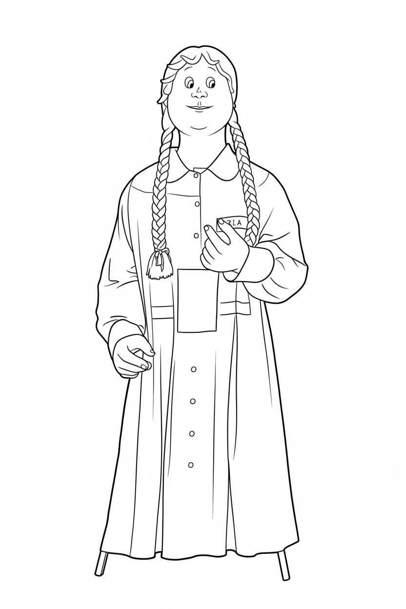 La gegantona Pia representa a una alumna amb la típica bata de l'escola. A les mans hi porta una goma i un llapis. Està feta a semblança dels gegantons de les Colònies Jordi Turull i els gegants de Sant Antoni. Va estar construïda durant un curs de les festes de primavera.