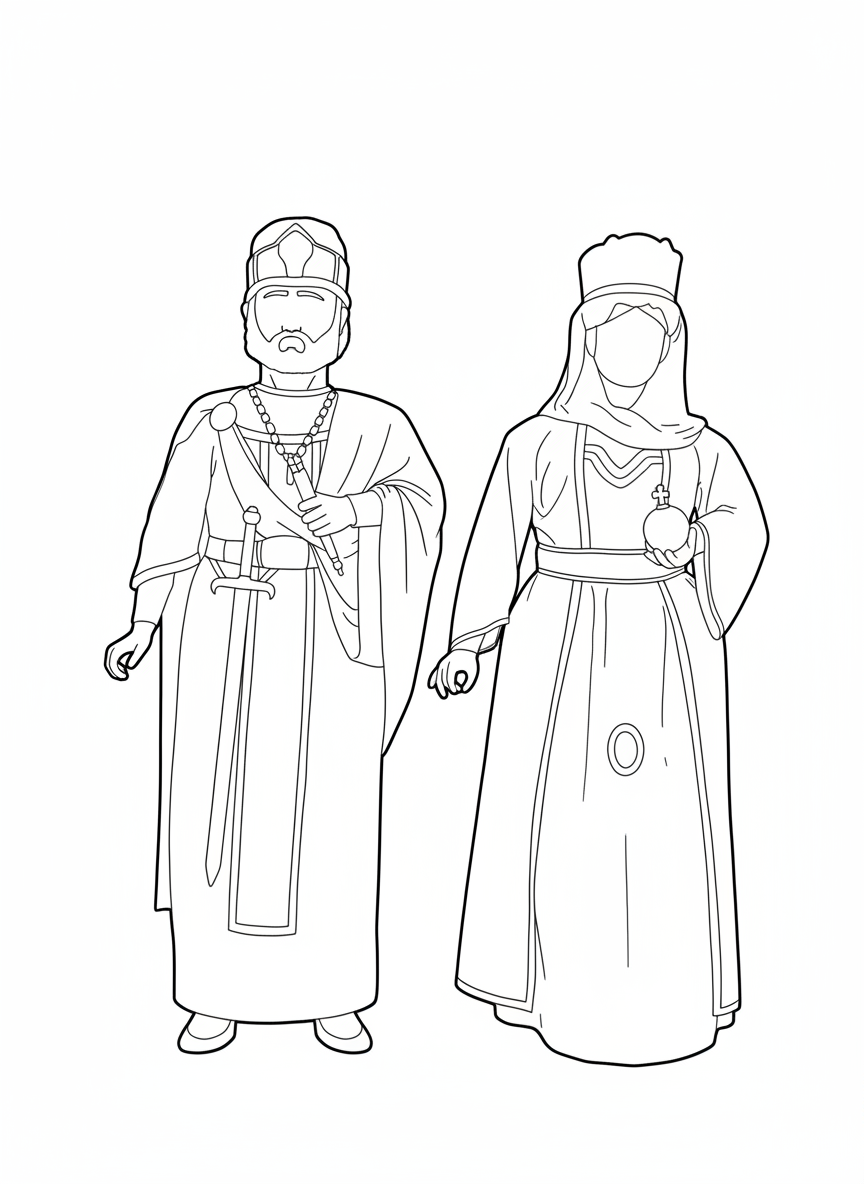 EL GEGANT: JUSTINIÀ I Justinià I representa un emperador real de l'Imperi Bizantí, un dels governants més destacats de l'antiguitat tardana. Va regnar del 527 al 565 dC, i és recordat per la seva gran reforma de les lleis romanes, coneguda com el Corpus Iuris Civilis, i per la seva voluntat de restaurar la grandesa de l'Imperi Romà. El gegant Justinià porta una túnica blanca amb detalls daurats i blaus, símbols de poder, justícia i divinitat. El mantell blau recorda la seva vinculació amb l'Església i l'autoritat celestial, mentre que la cintura ornamentada i la cuirassa daurada representen la seva força com a líder militar i polític. A la mà esquerra sosté un pergamí, com a record del seu famós codi de lleis i la seva saviesa. Al cap porta una corona bizantina molt detallada, amb pedres i ornaments que reflecteixen la riquesa de Constantinoble. LA GEGANTA: TEODORA Teodora, esposa de Justinià I, va ser una de les emperadrius més influents de Bizanci. Coneguda per la seva intel·ligència, determinació i defensa dels drets de les dones, va ser consellera clau del seu marit i figura decisiva en els assumptes de l'Imperi. La geganta porta una vesta llarga de tons vermellosos i daurats, símbols de noblesa i dignitat imperial. El seu vestit està ricament decorat amb brodats i pedreria, mostrant el refinament de la cort bizantina. Al cap porta una corona alta amb vel blanc, símbol de la seva condició d'emperadriu i de la seva puresa moral segons la tradició cristiana. A la mà dreta sosté un orbe daurat, representant el món sobre el qual regna conjuntament amb Justinià. Significat conjunt: Els gegants Justinià i Teodora representen la majestuositat i esplendor de Bizanci, una època de transici
