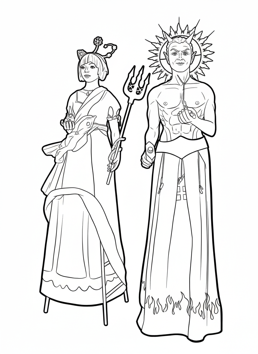 L'Aigua és una gegantona en femení per simbolitzar l'aigua com a element de fecunditat i naixement , origen de vida com és l'aigua i també el sexe femení. Al cap porta elements que són glaç cristal•litzat, o sigui les estrelles que forma el gel, una de les formes que adopta l'aigua. El cos porta una vestimenta amb elements i formes diferents que adopta l'aigua, formes aquoses de rius, de mar, d'onades . A la mà dreta hi té un gripau, un animal d'aigua dolça molt freqüent a la nostra comarca i un símbol de la vida animal que s'origina, i es transforma, al voltant de l'aigua. A la mà esquerra hi port una versió del trident de Neptú o Posidó, el déu del mar romà i grec, una referència a l'aigua dels oceans. Del vestuari en pengen unes botelles que van plenes d'aigua amb elements al seu interior. El gegant Foc porta al voltant del cap porta un cercle de foc, en referència al sol, la font de la calor i la vida humana i a més és una bola de foc des del punt de vista físic. La cara del gegantó és de diable i de follet. Diable com a símbol de l'Infern i del foc que crema i al mateix temps dels propis diables de la cultura popular que són un ball de foc. A la mà dreta porta un martell de ferrer, símbol del déu romà del foc Vulcà i del déu del foc grec Hefest. A la mà esquerra porta una flama que neix de la pròpia mà, com a símbol de la capacitat dels sers humans de fer «néixer» foc i de controlar el foc amb les nostres mans.