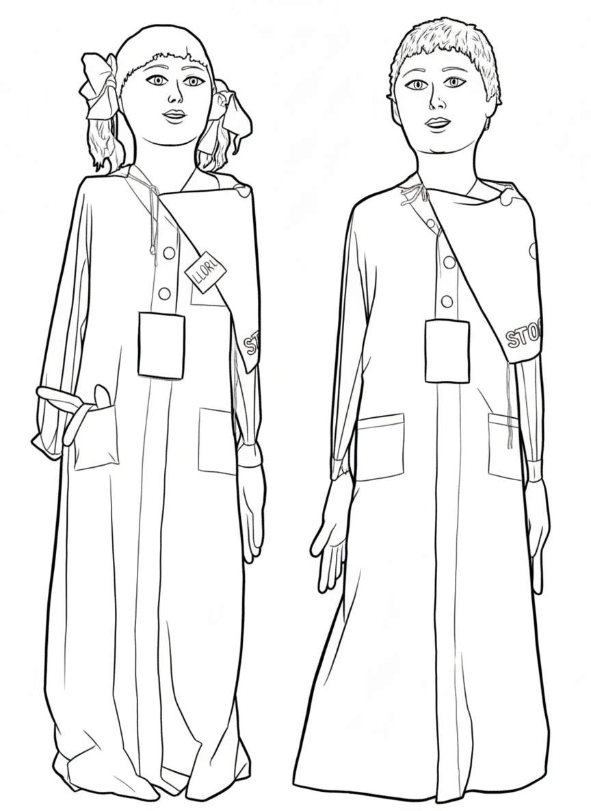 Els gegants representen a dos alumnes amb la bata de l'escola. Ell duu el nom del patró de l'escola Sant Ignasi, mentre que ella el nom fa referència al carrer on està ubicada l'escola el carrer Roger de Llúria.