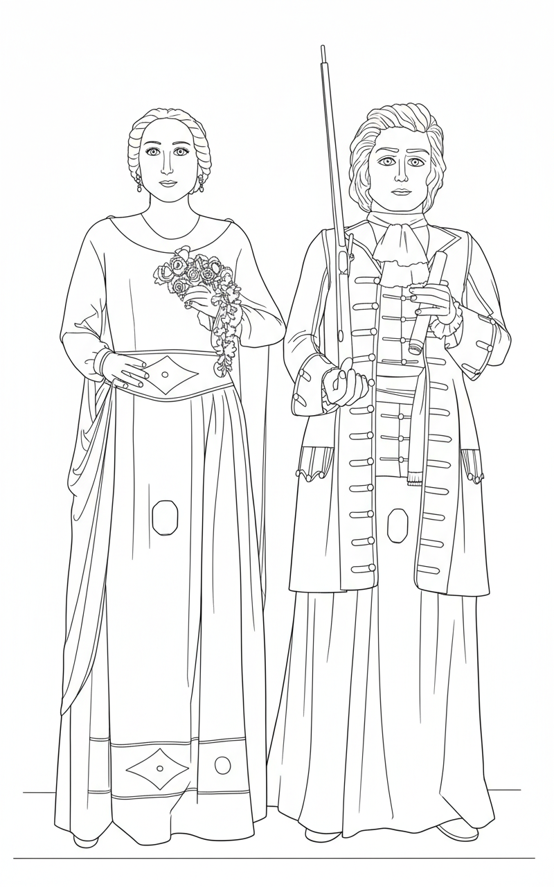 El gegant va vestit amb la mateixa indumentària que els generals de batalla de 1714, amb casaca, camisa i mocador exemptant el barret de tres puntes, ja que el cap està modelat a semblança del bust que hi ha en homenatge al General Moragues a Sant Hilari Sacalm, Sort i Barcelona. En una mà hi porta un fusell, símbol de la lluita armada, i en l'altra un pergamí simbolitzant el Pacte dels vigatans, del qual Moragues en va ser un signant. La geganta representa a la Cecília Regàs, esposa del Moragues.